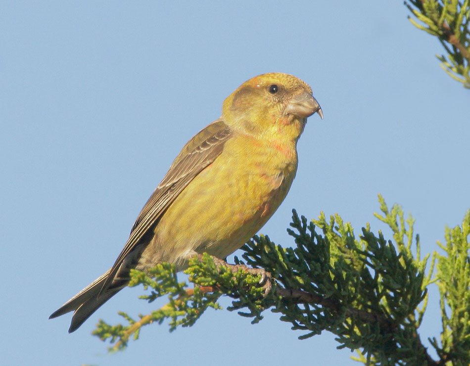I had the good luck to find this previously reported flock and have them pose for me in morning sun against a blue sky. The adult males are typically solid red, though they may also have some yellow; adult females are typically olive with varying amounts of yellow. The first-winter males are quite variable in plumage, but as I learned from Ron Thorn, who first found these birds, first-cycle birds retain their juvenal tail feathers until Spring, so these feathers should appear abraded in Fall as compared to adults' fresh ones. Another mark for first-cycle birds is buff tips to the wing coverts.