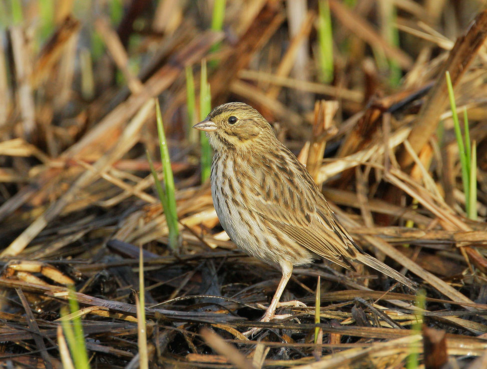 The birds left and above, photographed near San Francisco Bay but not in salt-marsh habitat, have an appearance sometimes associated with Savannah Sparrows found in grassy hillsides in the Bay Area -- paler colors, less extensive and narrower streaking on the chest, broader more distinct central crown stripe, and relatively pale supraloral yellow. It is an open question whether the grass-dwelling and marsh-dwelling Savannah Sparrows of the Bay Area are of different subspecies, and if so, to which they should be assigned. "Belding's," the dark salt-marsh subspecies found in Southern California and Baja, is sometimes considered a possible separate species, and some have thought the Bay Area marsh birds would fall within that group. |